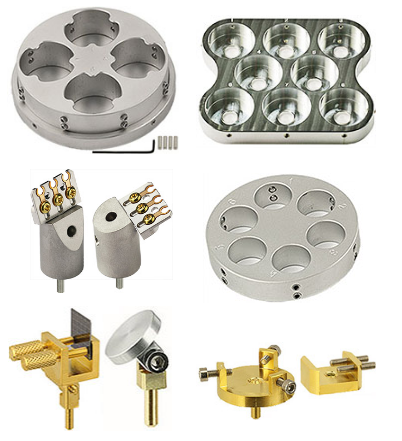 - EM-Tec R98 – Universal large bulk sample holder with 4 mounting pillars on a Ø117mm pin plate. Mounting pillars can be spaced on the pin plate to accommodate large awkwardly shaped sample op to 98mm in diameter. Made from vacuum grade aluminium with stainless steel thumb screws.