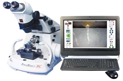 The basic model, the PT-XL, is controlled via a digital tactile controller and is suitable for routine work. From there, the system can be upgraded to a research level ultramicrotome with computer control and video options. Both models can be upgraded to allow for a 1mm uninterrupted sample advance, suitable for array tomography. The latest addition to the Powertome family is the PT-FL, with an ultramicrotome-mounted microscope that allows fluorescent signals to be located in the block during trimming and sectioning.