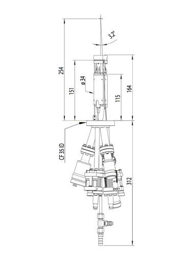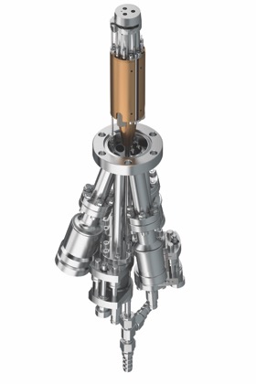 The three individual cells have crossing beams at about 93 mm distance from the exit aperture (254mm from the mounting flange) to ensure a maximum overlap of the evaporation area. Each cell is equipped with a separate filament and HV supply to prevent crosstalk. Three independent flux monitors enable the controlled stoichiometric growth of compounds.