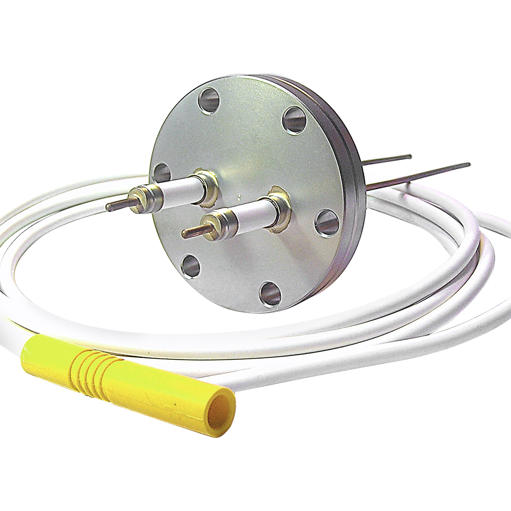 There are options for 1, 2 or 4 pins on a 40CF flange or the feedthrough can be supplied on CF, KF, ISO or custom flange designs.