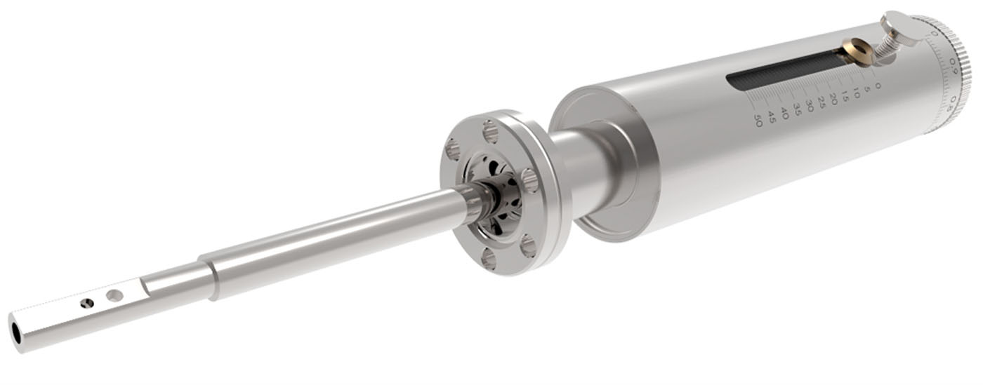 Bellows-sealed, precise lead-screw driven linear motion solutions for low load applications in ultra-high vacuum. Available in CF16 and CF35 flange sizes with stroke length options from 25mm to 150mm.