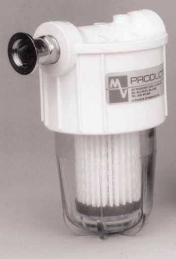 An MV VISI-MIST® oil mist eliminator attaches to your pump’s exhaust line, directing the exhaust through a pleated, low-resistance microfiberglass coalescing filter that removes mist before it gets into the room air. The clear styrene sump provides direct inspection of the status of the filter without disassembly.