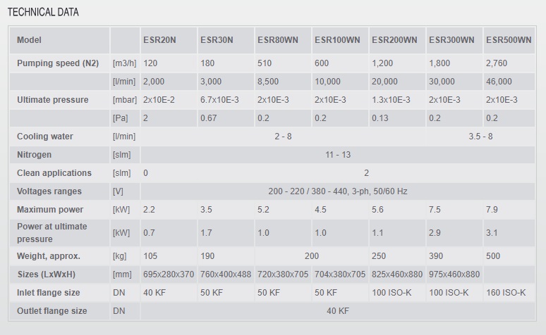The larger models ESR80WN, ESR200WN, ESR300WN and ESR500WN are combinations of main pump with an additional booster pump on top. Both pumps are Roots pumps.